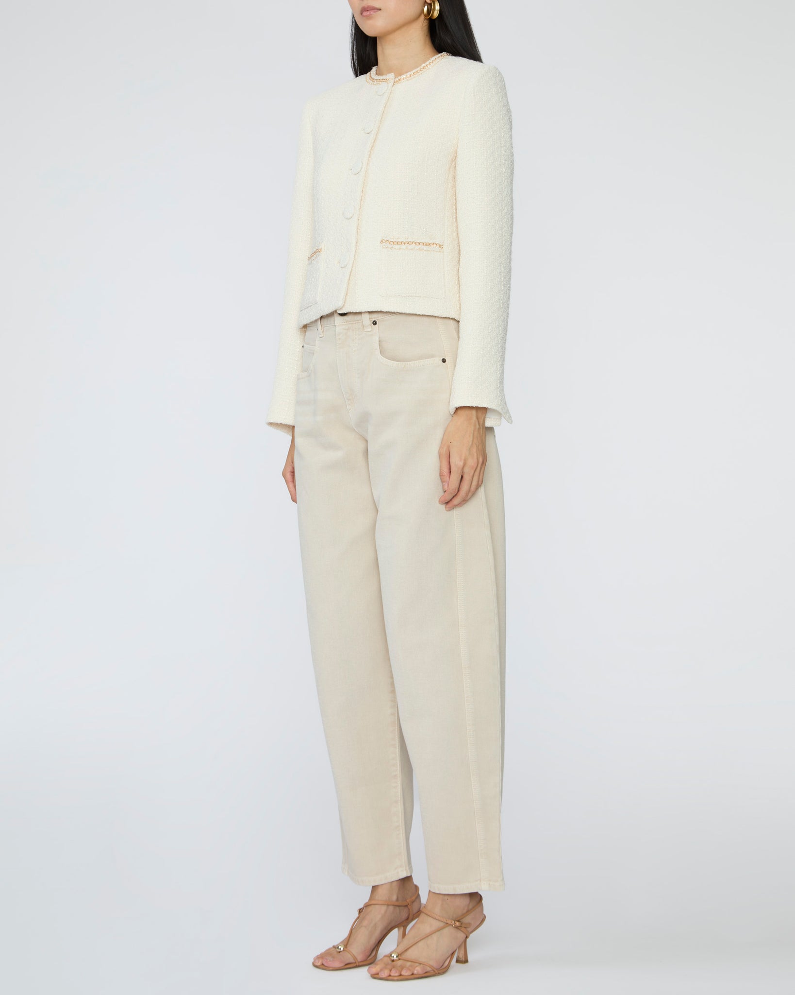 This jacket delivers instant elegance with chain-trim accents that act as built-in jewelry. Dressy yet understated, it elevates even the simplest outfit. Perfect for when you want polished without overstyling.