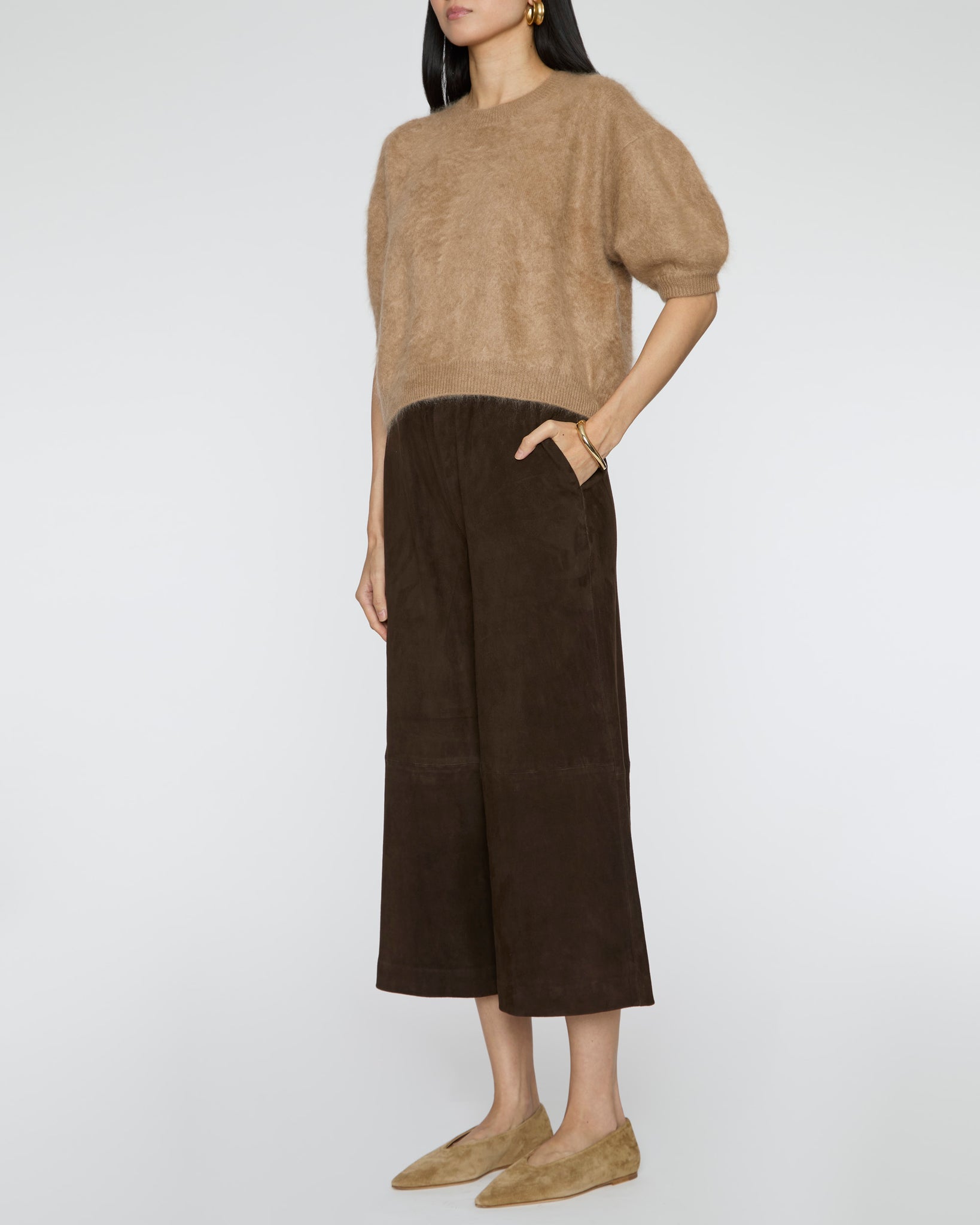 Lisa Yang’s chic, comfy knitwear are timeless staples. Made from ultra-soft brushed cashmere, they add a cozy yet elegant touch to any outfit.