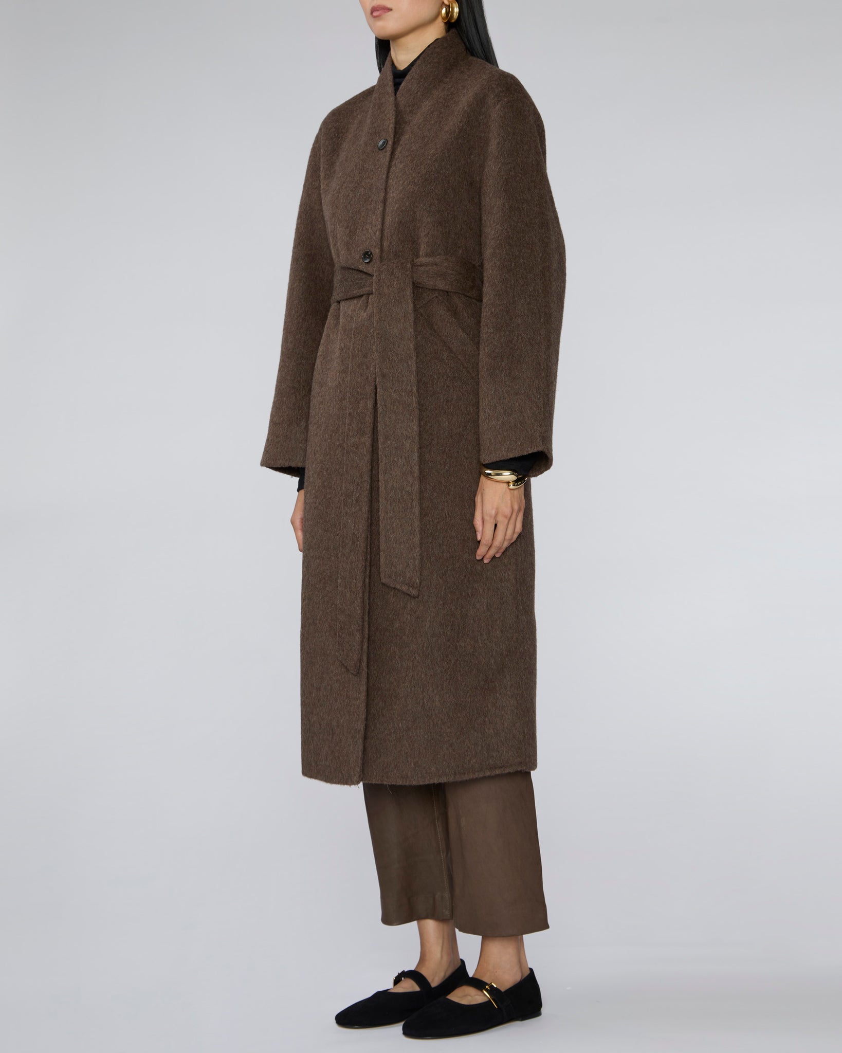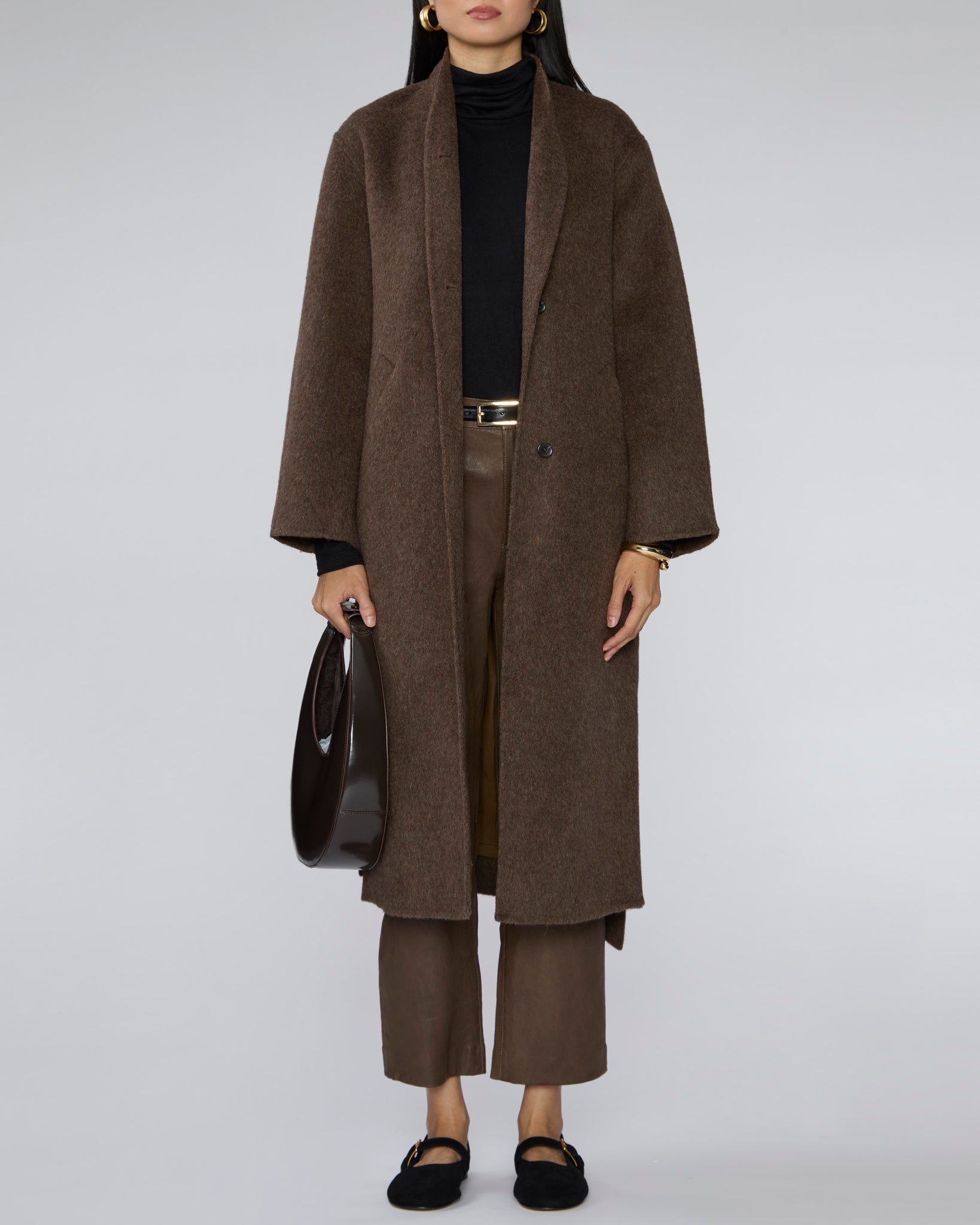 Simplicity makes the strongest statement in this coat. It embodies understated elegance with a minimal silhouette and rich wool texture. Wear it with the belt for a defined shape or without for an effortless, relaxed drape.