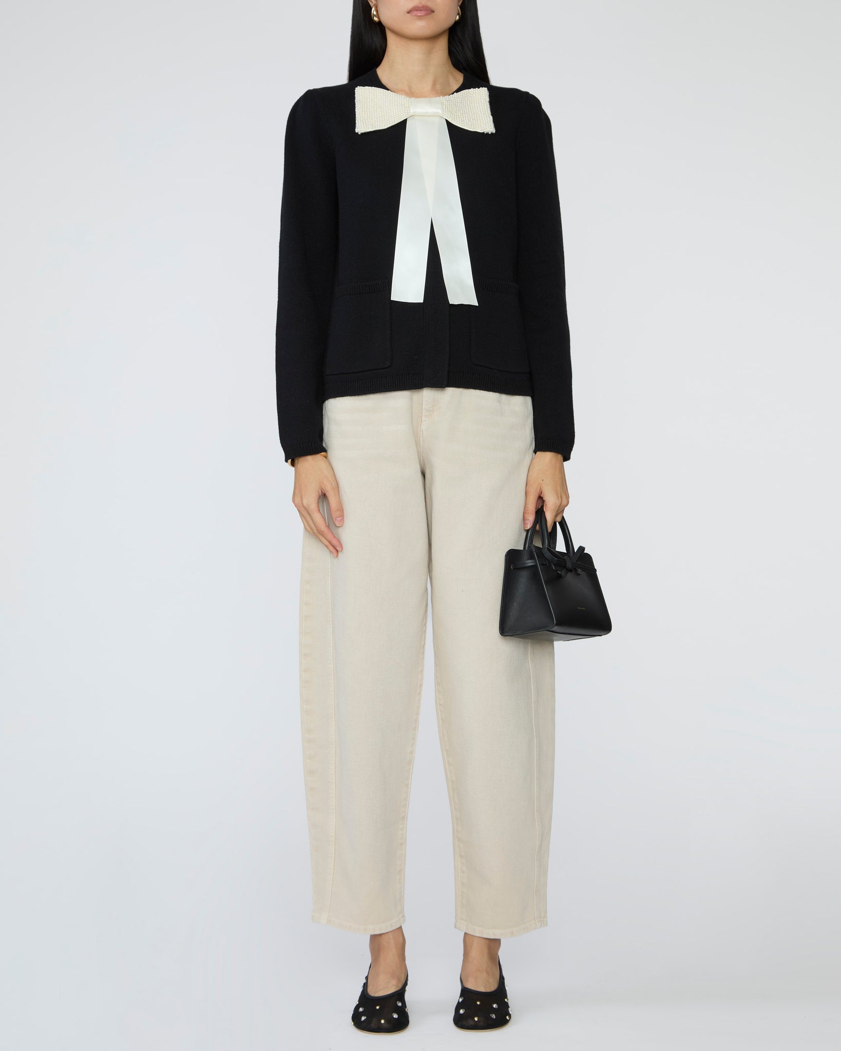 • Pearl-embellished bow with satin ribbon tails