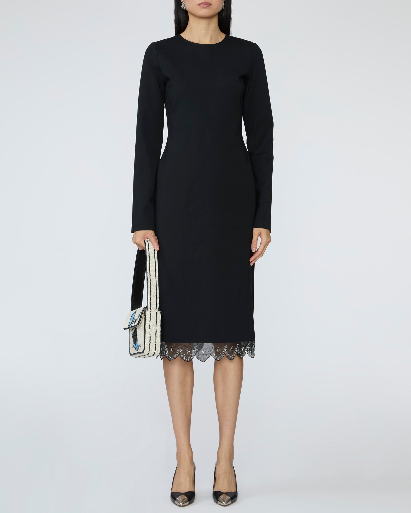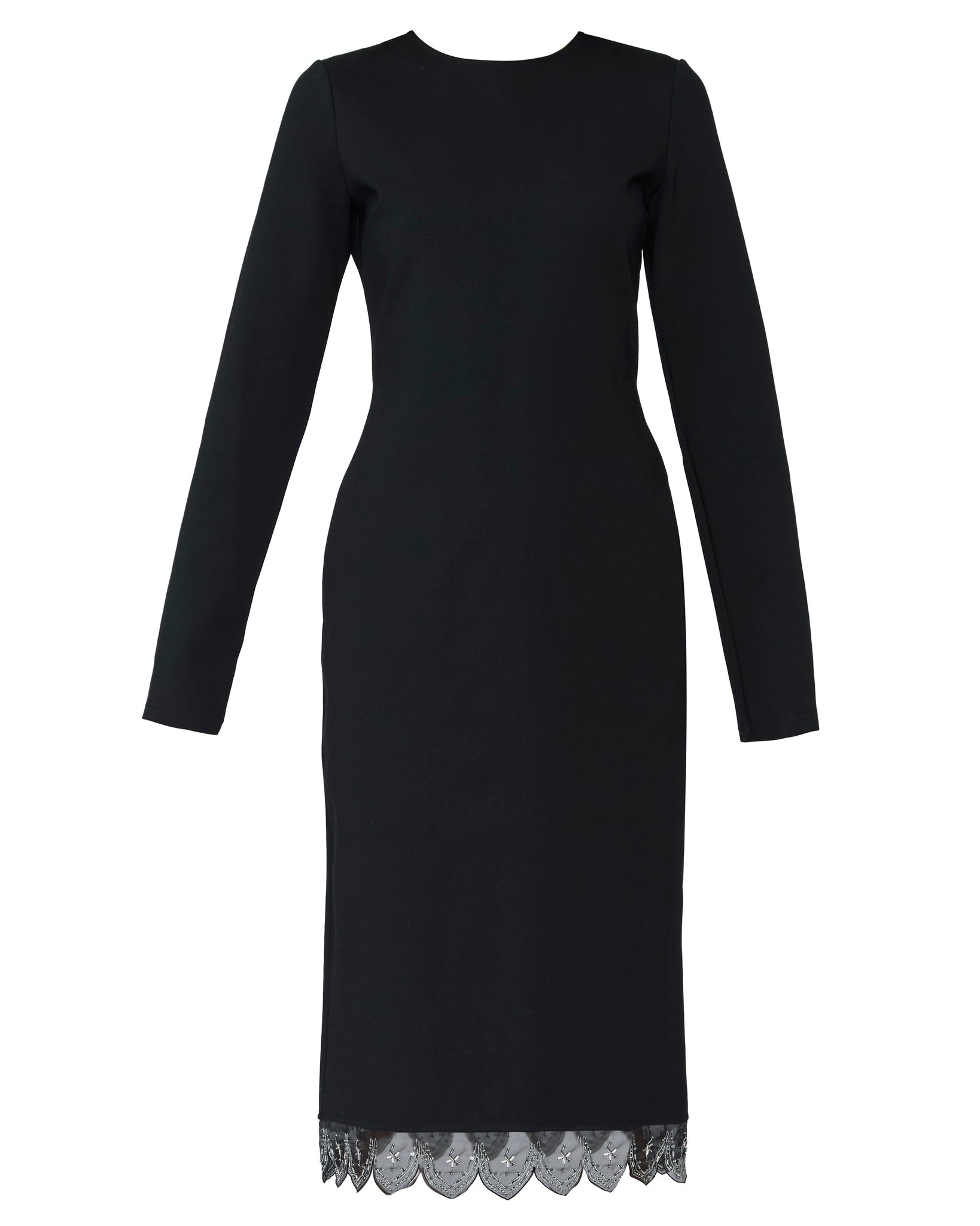 A classic black dress with a quietly striking twist. It pairs a clean silhouette with a delicate embellished hem that brings a hint of sparkle for a look that’s classic yet fresh.