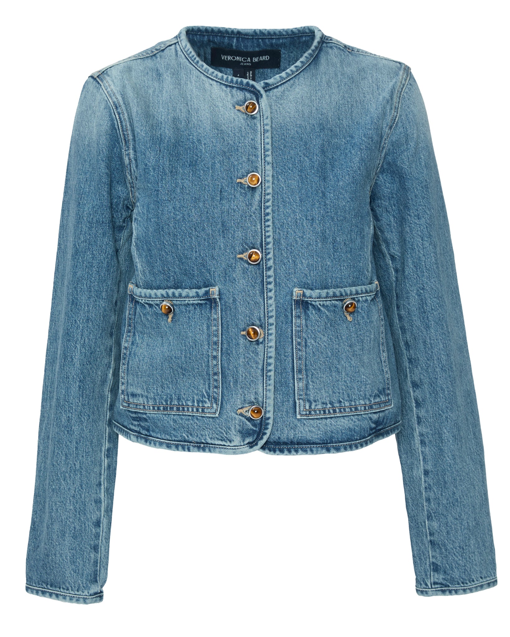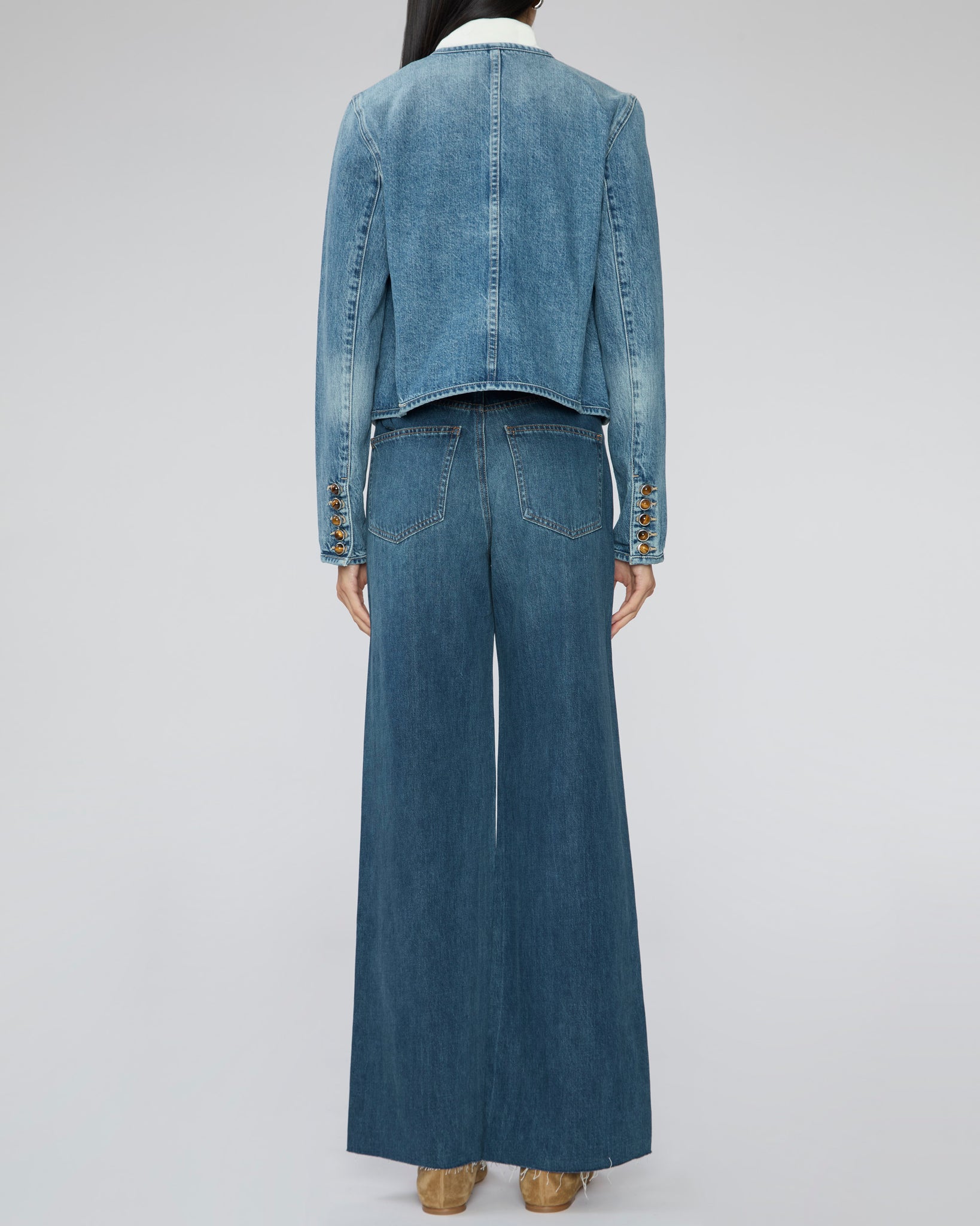This is not your average denim jacket, and that’s exactly why we’re obsessed with it. The glossy buttons look like polished gems you’d find on a bold vintage ring, adding a subtle but striking touch. The collarless neckline makes it easy to layer over turtlenecks or chunky knits, and the fit is just right—not too bulky, not too tight.