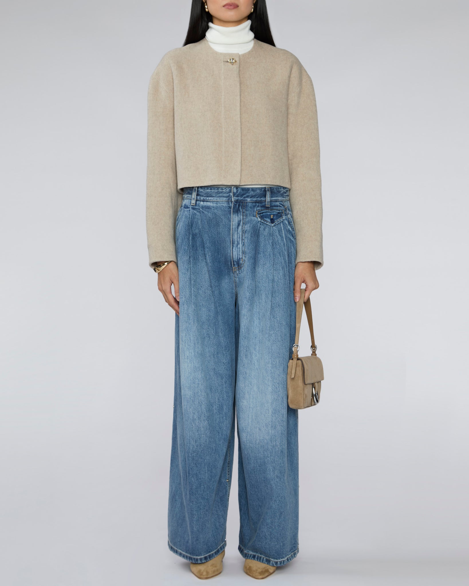 There’s something quietly powerful about this jacket. Its cropped, sculptural shape feels modern and artful, giving everything you pair it with a subtle statement. The single knot button adds just the right touch of sophistication, a small detail that makes a big impact.